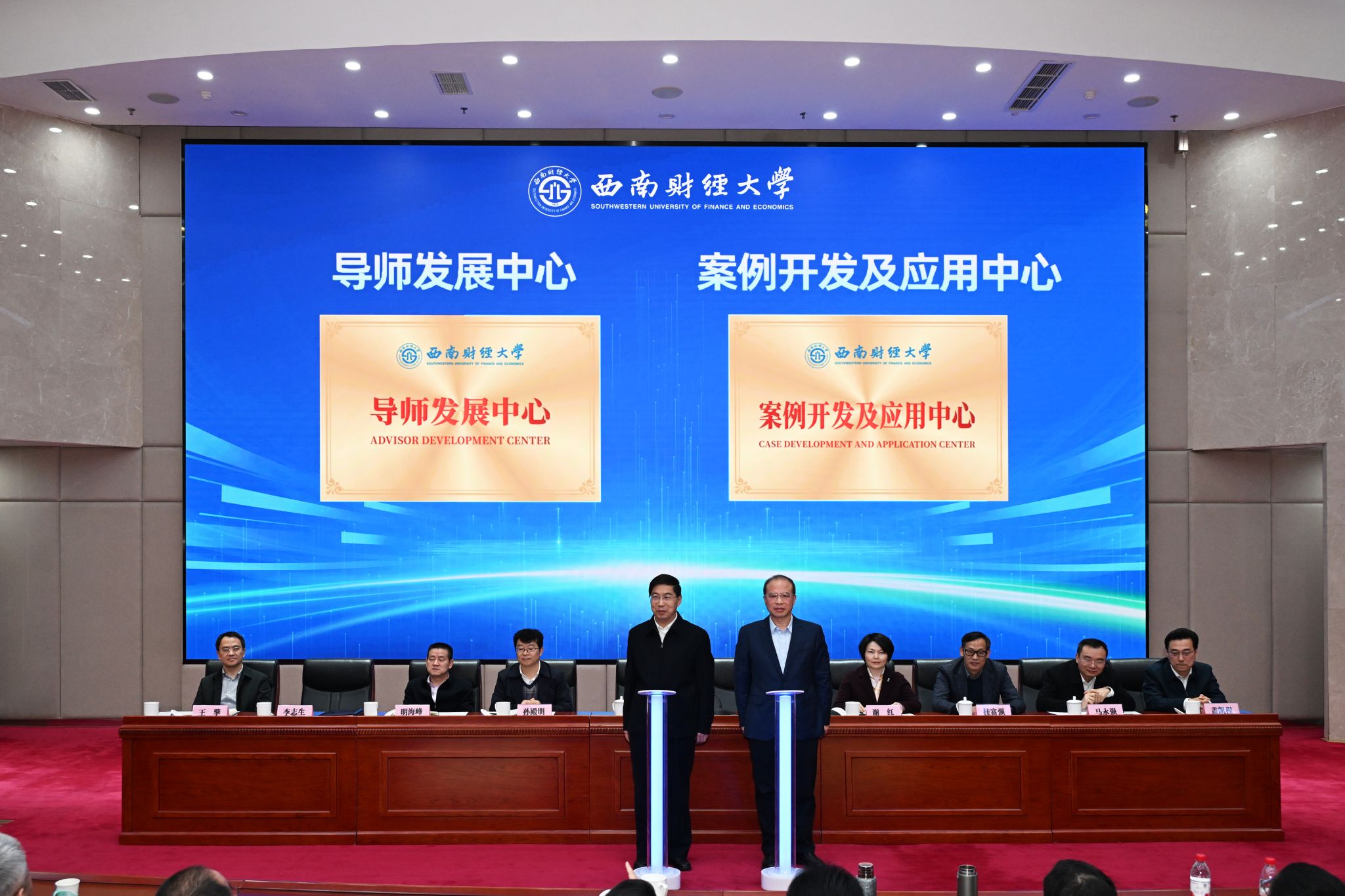 大会交流环节,国际商学院党委书记叶作亮,金融学院、中国金融研究院院长罗荣华,经济学院副院长韩文龙,经济与管理研究院执行院长董艳,工商管理学院教师陈桓亘,浪潮集团四川公司总经理张振宏先后作交流发言。交流环节后,大会举行导师发展中心、案例开发及应用中心揭牌仪式。