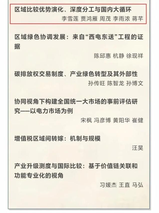 近日,我校国际商学院国际贸易学专业2023级博士生贾鸿雁和经济学院李雪莲教授、国际商学院周茂教授、李雨浓教授(通讯作者)、国际贸易学专业2021级博士生蒋芊(毕业后就职于广西民族大学)共同撰写的论文《区域比较优势演化、深度分工与国内大循环》在《经济研究》2025年第6期刊出。